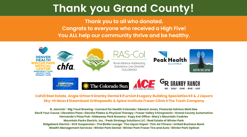 We are having so much fun processing all the High Fives that folks gave to community members, businesses and organizations to show their gratitude to anyone who supports them in living happy and healthy lives. At the same time, your donations will support our organization’s efforts to help everyone in our community have what they need to thrive and be healthy. Thank you to all who donated and to our amazing sponsors too.
